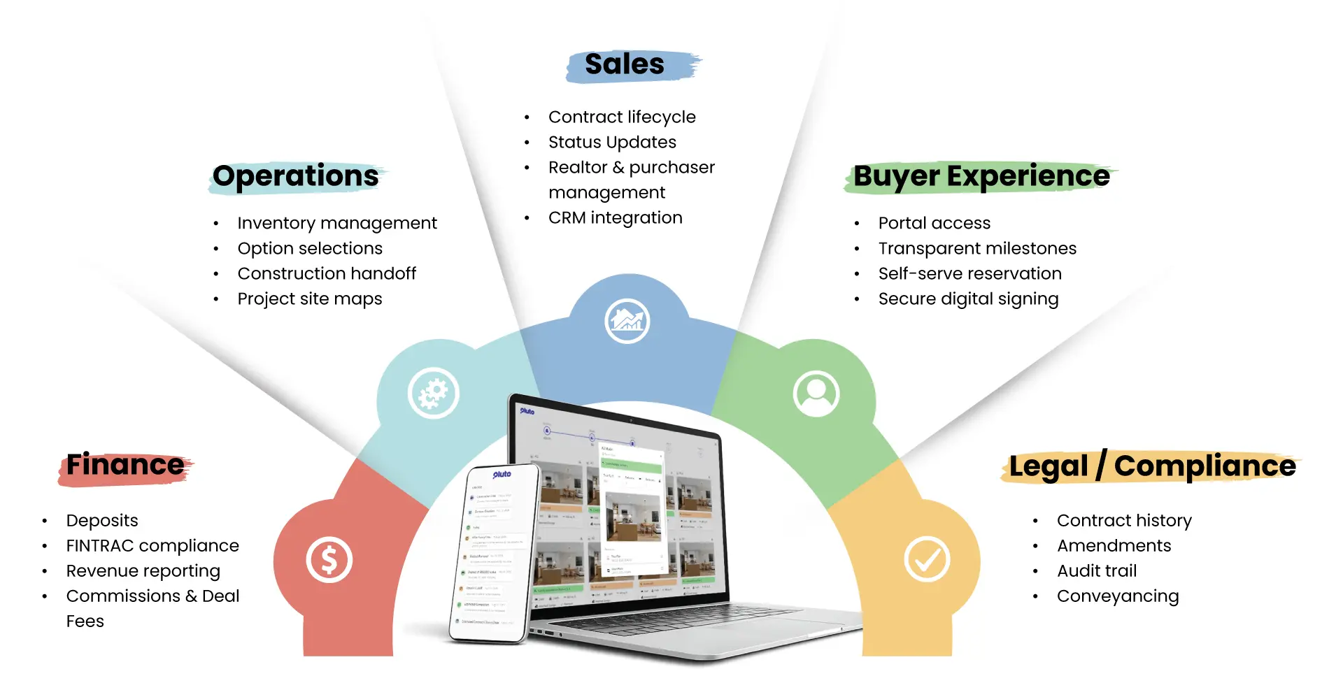 Pluto is purpose-built for developers and builders managing live inventory, contracts, deposits, amendments, upgrades, and internal coordination between sales and construction.