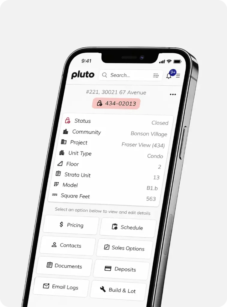 Pluto is purpose-built for developers and builders managing live inventory, contracts, deposits, amendments, upgrades, and internal coordination between sales and construction.